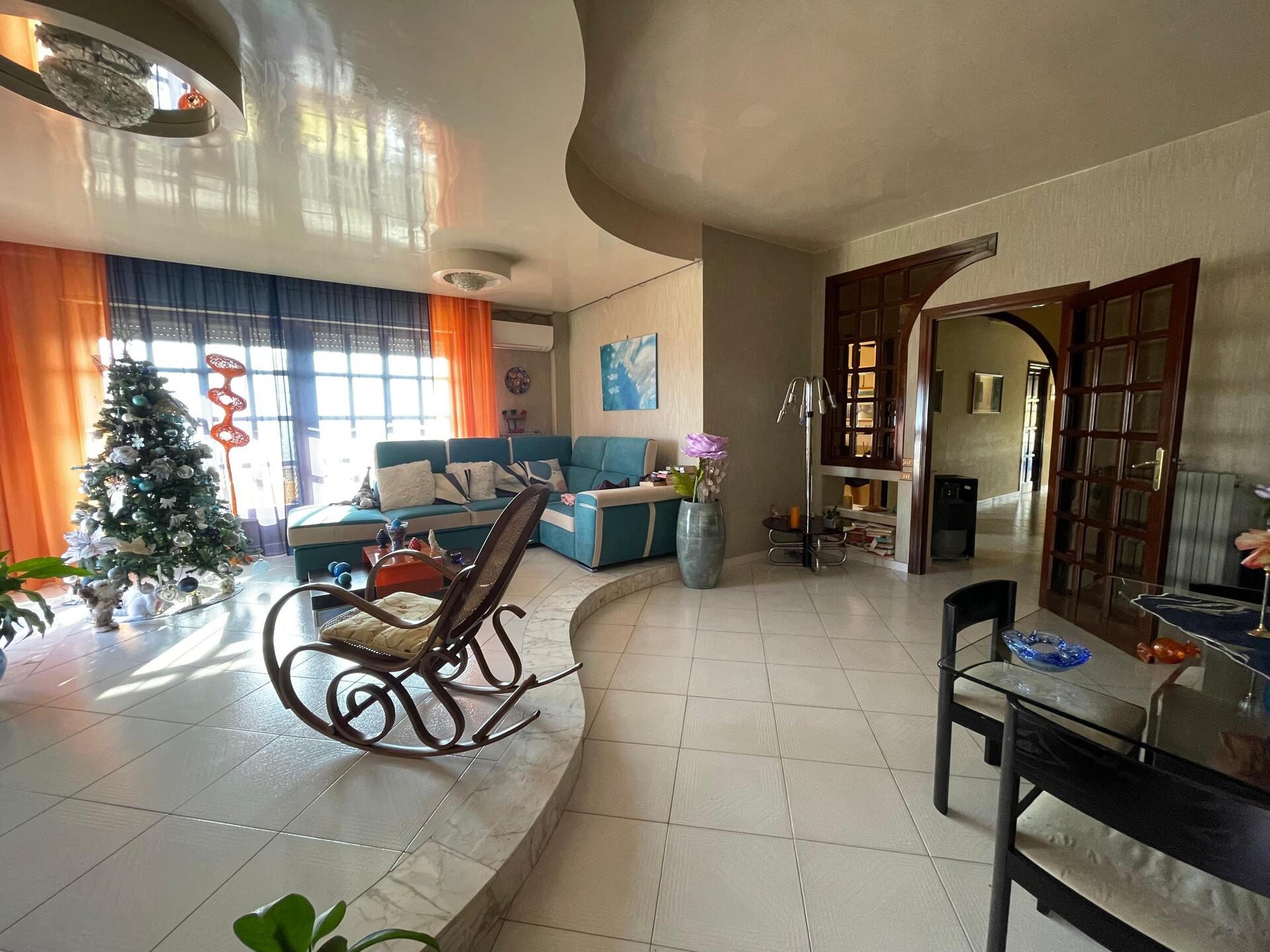 Gli spazi interni si articolano in un ingresso su una saletta di disimpegno, un ampio e luminoso salone, tre camere da letto, doppi servizi (uno dotato di vasca idromassaggio e l'altro con doccia) e un pratico ripostiglio.
